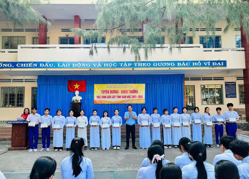 Kỳ thi chọn học sinh giỏi THPT cấp Tỉnh năm học 2025 – 2026 vừa qua đã ghi nhận những kết quả đáng tự hào của các em học sinh trường THPT Nguyễn Ngọc Thăng. Những kết quả ấy không chỉ là minh chứng cho sự nỗ lực bền bỉ của các em mà còn thể hiện tâm huyết, trách nhiệm của quý thầy cô trong công tác giảng dạy và bồi dưỡng. Trong giờ chào cờ đặc biệt sáng ngày 12 tháng 4 năm 2026, trường THPT Nguyễn Ngọc Thăng long trọng tổ chức Tuyên dương – Khen thưởng HSG cấp Tỉnh năm học 2025 – 2026 nhằm biểu dương những nỗ lực, cố gắng của học sinh trong các đội tuyển dự thi kỳ thi chọn học sinh giỏi cấp tỉnh THPT năm 2026 vừa qua; ghi nhận xứng đáng đối với thành tích mà các em đạt được đồng thời lan tỏa tinh thần hiếu học, khát vọng vươn lên của các em HS; tạo động lực để các đội tuyển HSG của trường tiếp tục gặt hái nhiều thành tích hơn nữa trong những năm học tiếp theo.